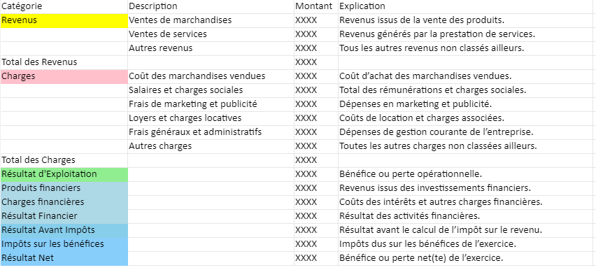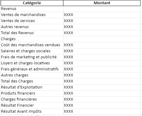 Résultat Net XXXXCe modèle présente les principales catégories de revenus et de charges couramment rencontrées dans un compte d’exploitation. Il convient de remplacer les XXXX par les montants réels correspondants de l’entreprise pour chaque ligne. Généralement, on inclut les produits financiers et les charges financières pour calculer le résultat financier. Ensuite, on ajoute ou on soustrait ce résultat d’exploitation pour obtenir le résultat avant impôts. Enfin, on déduit les impôts sur les bénéfices du résultat avant impôts pour calculer le résultat net.