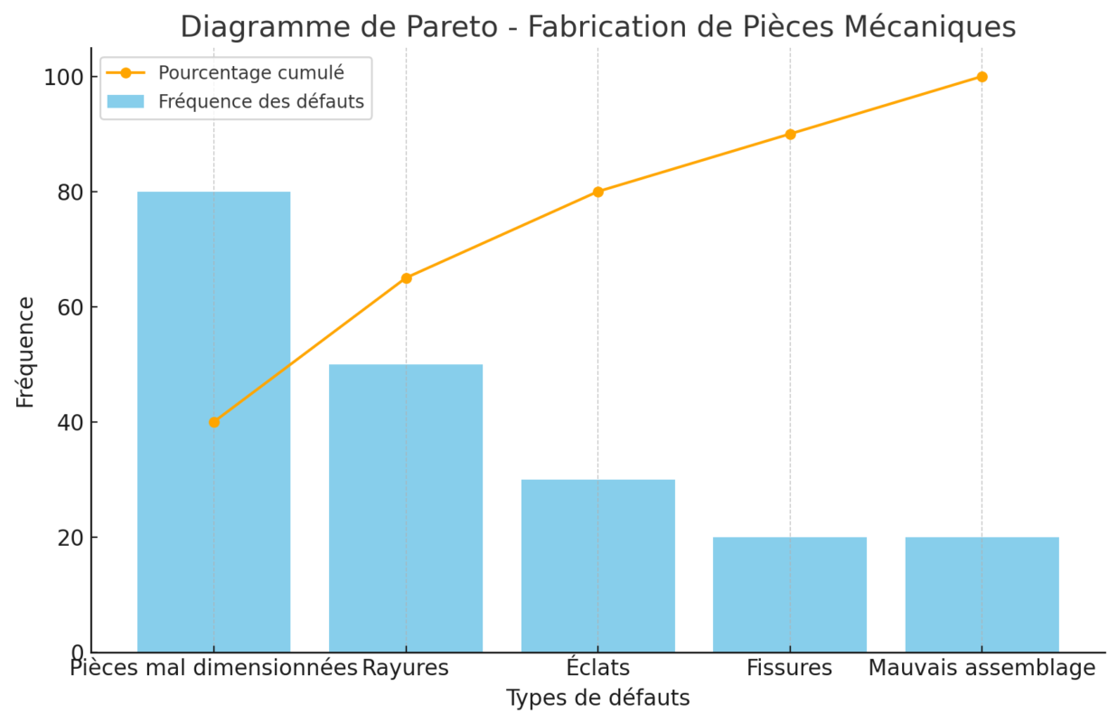 - Diagramme de Pareto – Fabrication de Pièces Mécaniques : Ce diagramme montre que les pièces mal dimensionnées et les rayures représentent les défauts les plus fréquents. En se concentrant sur ces deux catégories, l’entreprise pourrait réduire significativement le nombre total de défauts.
