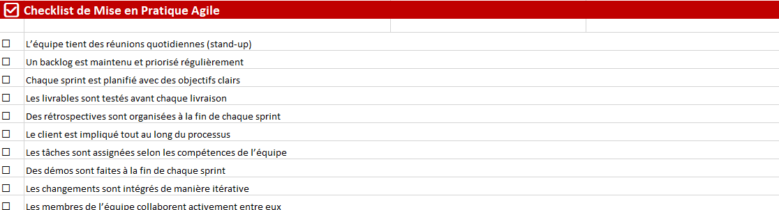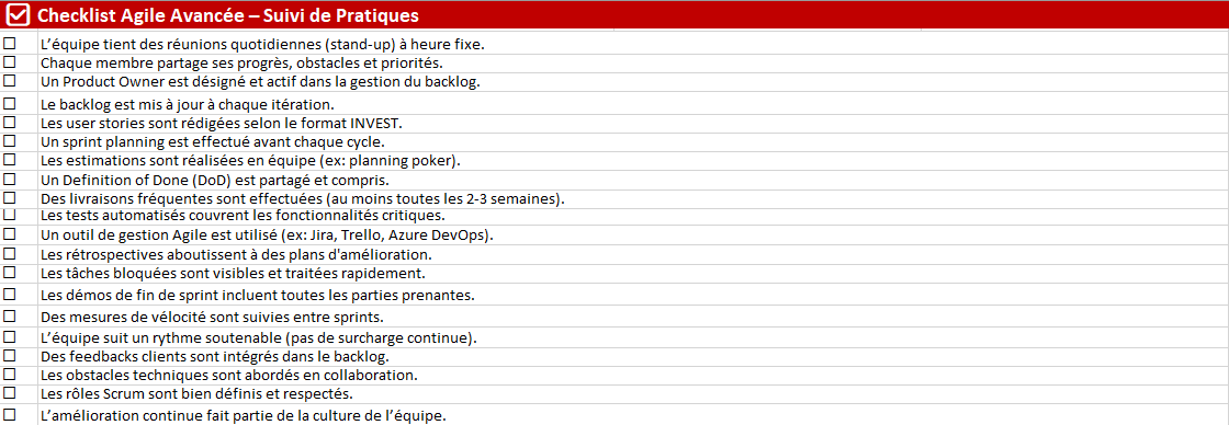 Modèle Excel – Manifeste Agile et Checklist de Pratiques