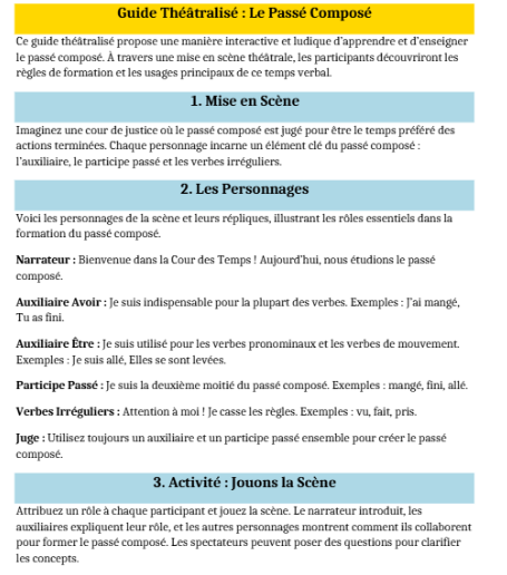 Le guide théâtralisé sur le passé composé est un outil pédagogique innovant qui combine apprentissage, interaction, et divertissement. Il aide les apprenants à s’approprier les concepts du passé composé de manière claire et engageante, tout en offrant aux enseignants un support attrayant pour dynamiser leurs cours.