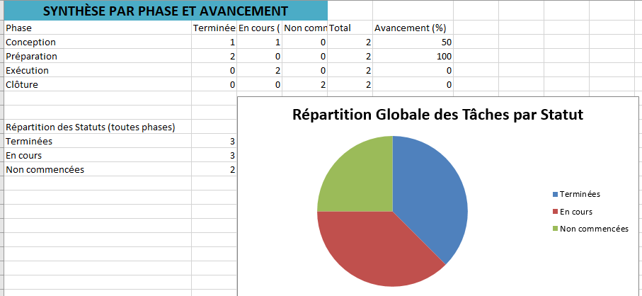 L’un des grands atouts de ce plan d’action projet est sa capacité à synthétiser l’avancement en temps réel :