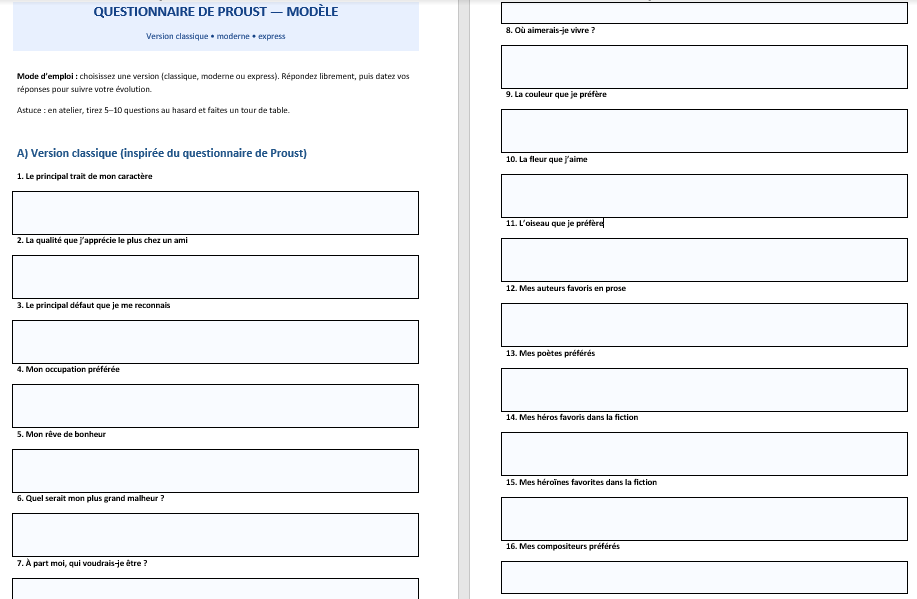 Objet : Atelier “Questionnaire de Proust — version moderne” (60 min)