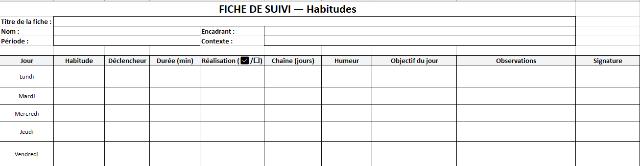 Une bonne unité de suivi tient en une ligne : une date, un contexte, un objectif, deux ou trois indicateurs fermés (listes déroulantes, cases à cocher), une remarque de 10–15 mots.