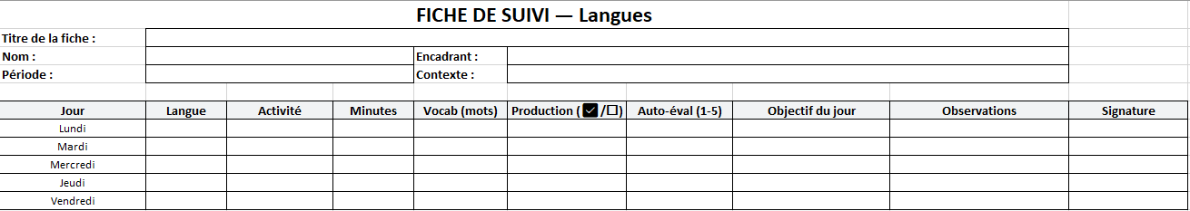 - Langues : qualifier la modalité (écoute/lecture/parole/écriture), la durée, un indice de production (réalisée ☑/☐). On suit l’exposition régulière à la langue.