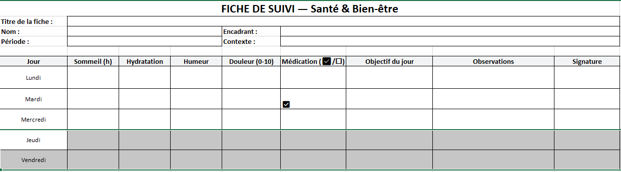 - Habitudes / hygiène : chaîne de jours réalisés, humeur déclarative, déclencheur. On travaille la constance plus que l’exploit.