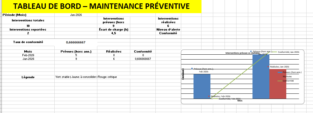 ☑️Tableau de bord de maintenance préventive : exercices d’analyse des indicateurs Lire la conformité, comprendre les reports, interpréter les écarts de charge et prioriser les actions.