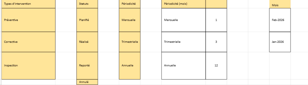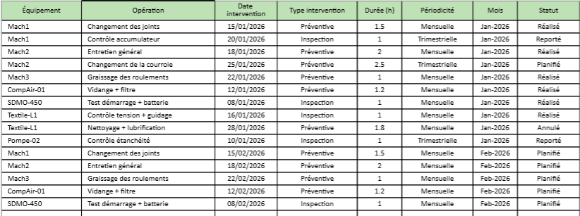 Le préventif vise la réduction des arrêts et des pannes répétitives. On suit la part des arrêts sur équipements couverts et le volume de curatif non planifié.› Structure des données dans Excel La table de données avant les graphes : c’est elle qui sécurise tout.