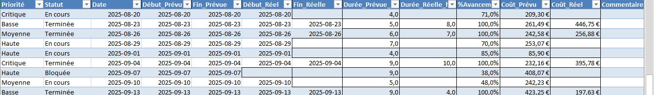 Vous voyez une cellule en rouge ? Retournez la corriger : ce sont des incohérences usuelles (ex. Fin avant Début, Terminée sans Fin_Réelle…).
