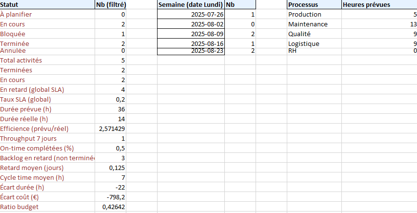 - Terminées / En cours / Bloquées : l’état réel du portefeuille d’activités.