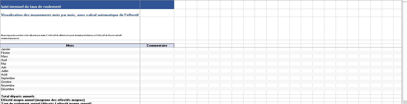 Taux de roulement = Nombre de départs sur la période / Effectif moyen de la période