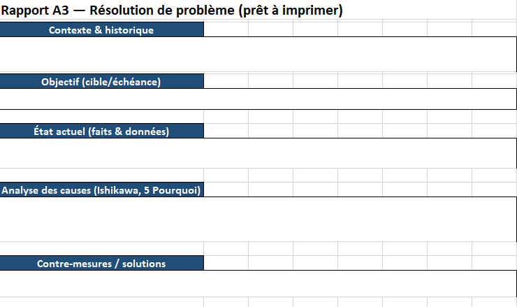 Texte. Gabarit prêt à remplir pour conduire un A3 complet : zones dédiées au diagnostic (données, Ishikawa/5 Pourquoi), au plan d’action (Qui/Quoi/Quand/Indicateur/Risque) et à la vérification avant/après. La structure favorise la synthèse et l’apprentissage.