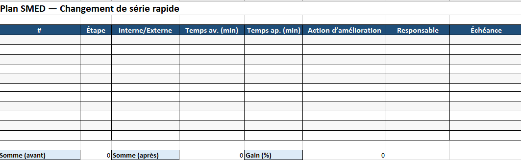 Texte. La feuille recense les étapes de changement, qualifie interne/externe, compare les temps avant/après et calcule automatiquement le gain (%). Un graphique colonnes met en évidence les progrès et les gisements restants.