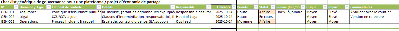 - Covoiturage — Sécurité : « Vérifier RC + Garantie Conducteur », Responsable assurance, échéance fin du mois, Priorité Haute, statut En cours.