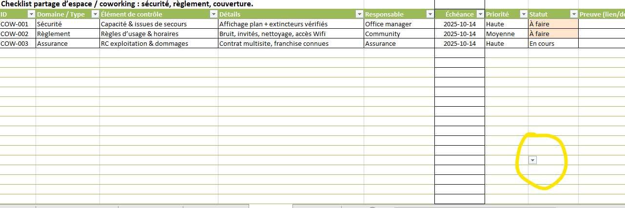 - Changer les listes : ouvrez l’onglet Listes et modifiez les valeurs (ex. ajouter un statut « À valider »). Les menus déroulants suivront.