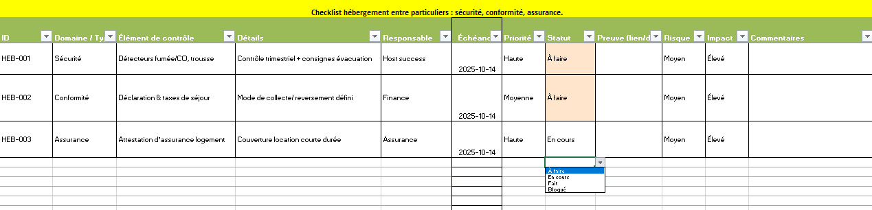 - Hébergement P2P : « Détecteurs fumée/CO testés », Host success, Fait, preuve = rapport trimestriel.