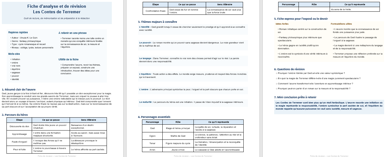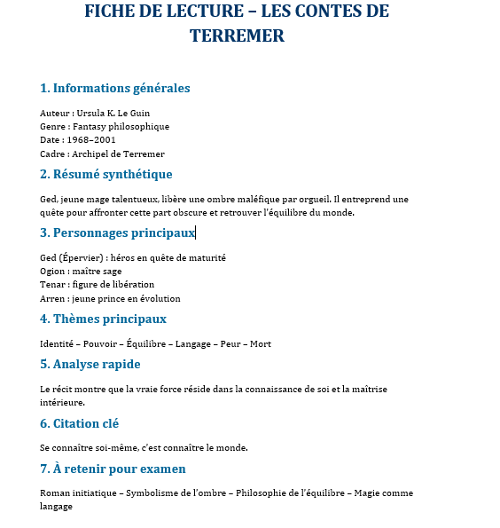 Le titre Les Contes de Terremer peut désigner, selon le contexte, soit l’ensemble du cycle dans une formulation générale, soit plus précisément le recueil tardif qui enrichit l’univers de nouvelles et de textes complémentaires. Dans une approche scolaire ou de fiche de lecture large, on parle souvent de Terremer comme d’un ensemble cohérent centré sur le monde, les personnages, les thèmes et l’évolution spirituelle des héros.