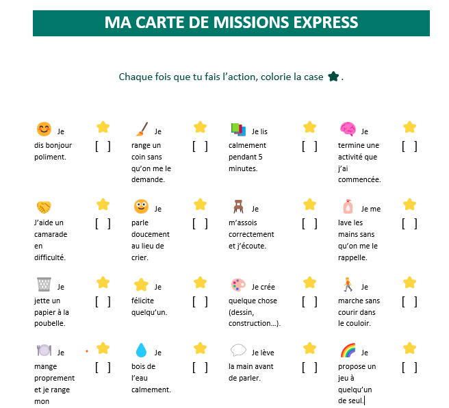 Pour l’enfant, la fiche n’est pas un “document administratif”. C’est un support de jeu : cases à colorier, étoiles à remplir, chemin à parcourir, badges à gagner, fusée à compléter. Chaque signe visuel correspond à un geste du quotidien : dire bonjour, aider un camarade, ranger un espace, terminer une activité, parler calmement. La gamification transforme ces gestes en petites missions.