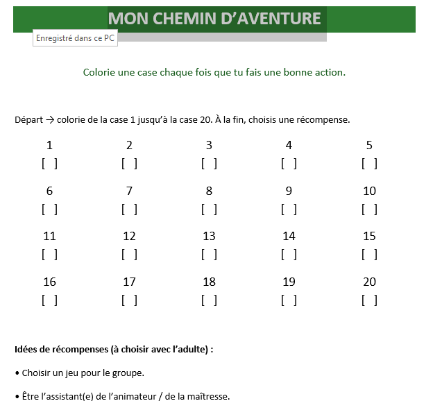 D’autres fiches prennent la forme d’un chemin d’aventure, avec des cases numérotées à colorier. Chaque case représente une bonne action du jour. L’enfant avance visuellement sur le chemin, seul ou avec le groupe. L’arrivée n’est pas un “cadeau matériel”, mais une reconnaissance : choisir un jeu, lire l’histoire du soir, être l’assistant de l’animateur pendant quelques minutes.