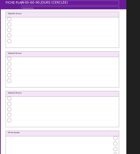 - Onboarding 30–60–90 : la fiche joue la partition des attentes ; à J+30, les cercles « capteurs » (KPI) disent la vérité—en noir sur blanc.