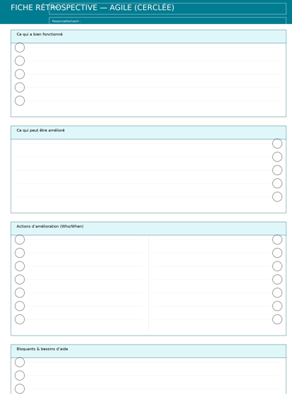 - À quoi ça sert ? Sortir des ressentis : bien fait / à améliorer / actions d’amélioration / bloquants / propriétaires.