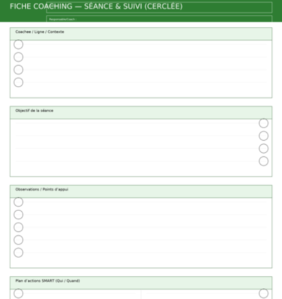 - À cocher : engagements du coaché, métriques de progression, points d’appui.