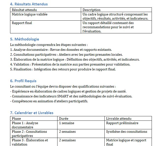 Les Termes de Référence (TDR) constituent un document essentiel dans la gestion de projet. Ils définissent les objectifs, les résultats attendus, et les responsabilités des parties prenantes. Lorsqu’il s’agit d’élaborer un cadre logique, les TDR fournissent une base méthodologique qui garantit que le projet est structuré, mesurable et orienté vers des résultats concrets.