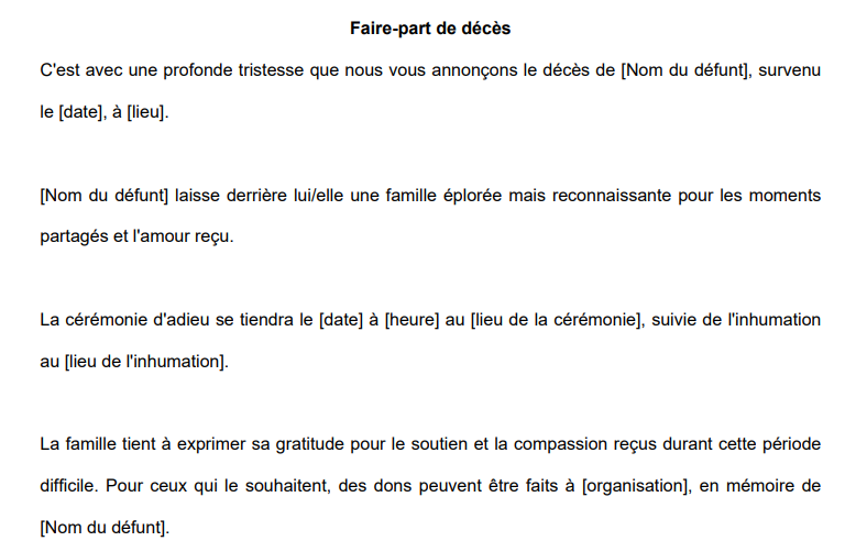 C’est avec une profonde tristesse que nous vous annonçons le décès de [Nom du Défunt], survenu le [date du décès], à l’âge de [âge du défunt]. En ces moments difficiles, nous tenons à exprimer notre soutien et notre solidarité envers la famille et les proches de [Nom du Défunt].