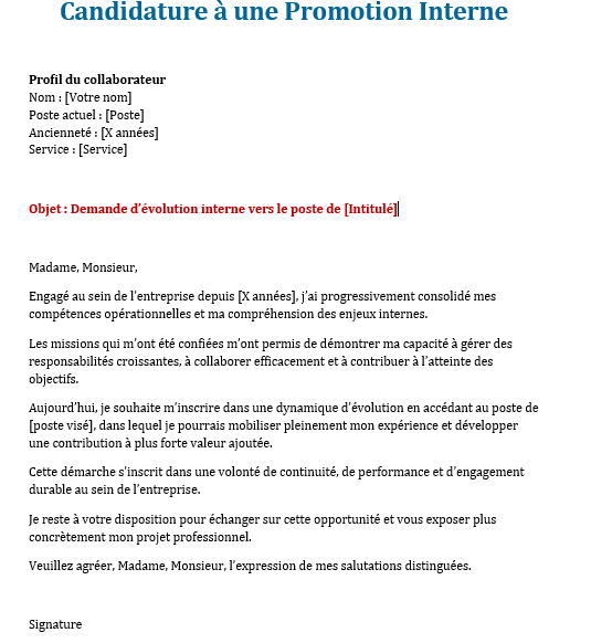 Une lettre de motivation promotion interne gagne en force lorsqu’elle met en évidence :