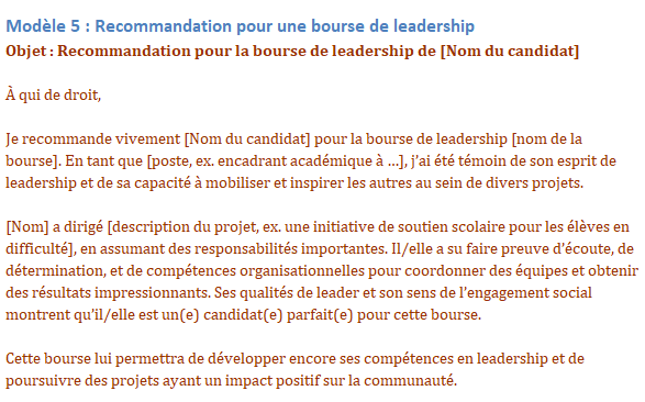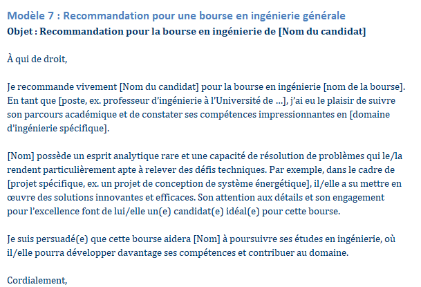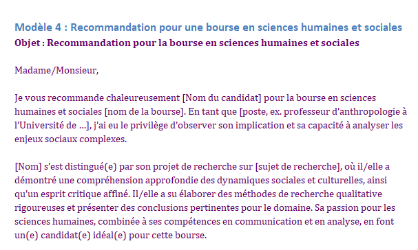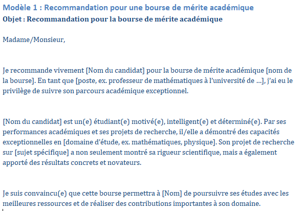 - Oublier d’adapter la lettre à la bourse : Les qualités du candidat doivent correspondre aux critères de la bourse. Évitez une lettre de recommandation générique.