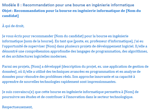 Voici quelques modèles spécifiques supplémentaires de lettres de recommandation pour des bourses. Ces lettres sont adaptées à différents types de bourses et mettent en avant les qualités académiques, de leadership, ou d’engagement communautaire du candidat.