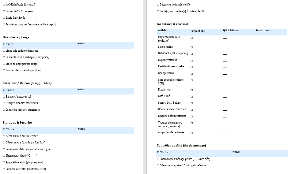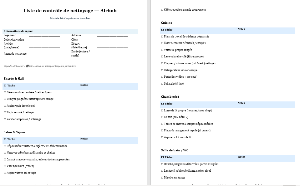 Ce guide accompagne le modèle Word prêt à imprimer que vous venez de télécharger. Il explique comment l’utiliser, comment l’adapter à votre bien et comment l’industrialiser (temps, stocks, photos de preuve, suivi des anomalies) pour éviter les réclamations et accélérer les turnovers.