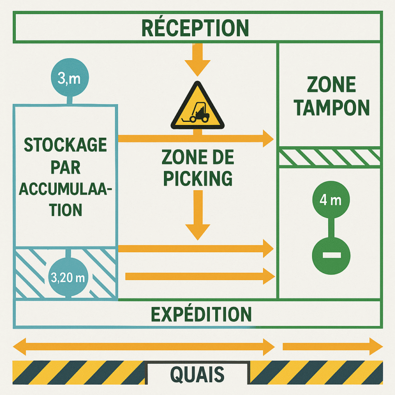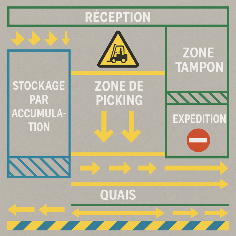 - Flèches partant des quais de réception, traversant la zone tampon puis se dirigeant vers l’entrée des allées de stockage/picking.