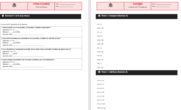 Le thème “coccinelles” se prête très bien à ce travail : collections, déplacements, partages, comparaisons, situations de “j’ajoute / j’enlève”. On raconte une petite scène et, sans forcer, l’élève apprend à raisonner.