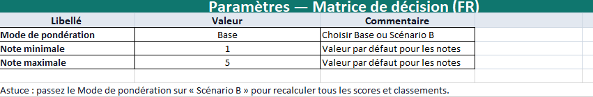 • Pondération collective : faites valider les poids par un groupe (réduit les biais individuels).