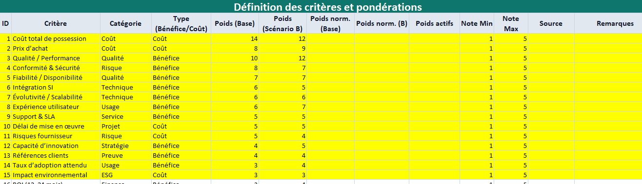 • ID, Critère, Catégorie, Type (Bénéfice/Coût)