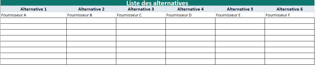 • Lignes prêtes pour 6 options (ex. Fournisseur A…F).