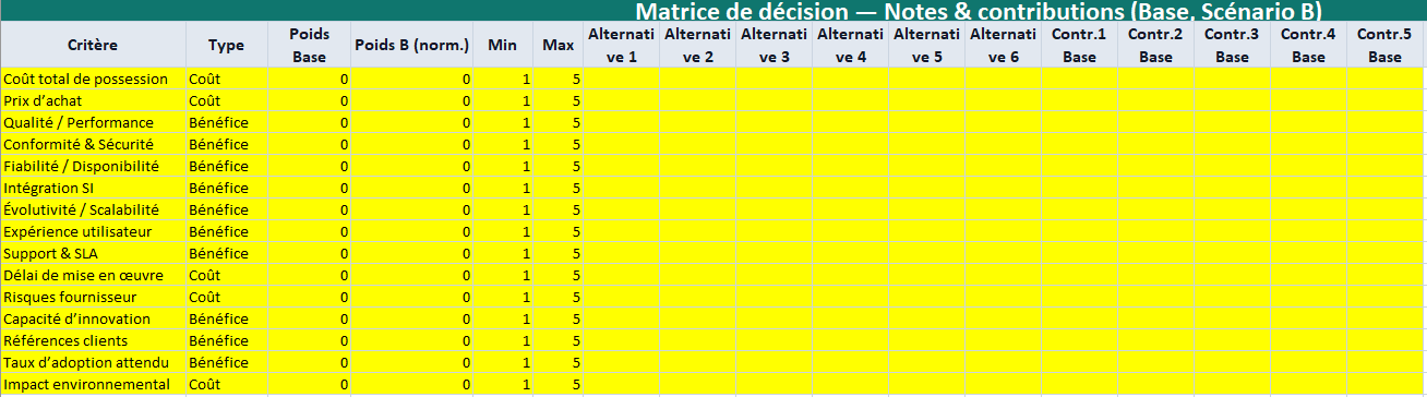 • Matrice_Decision : saisie des notes, calcul des contributions (Base & Scénario B) par critère et alternative, heatmap.