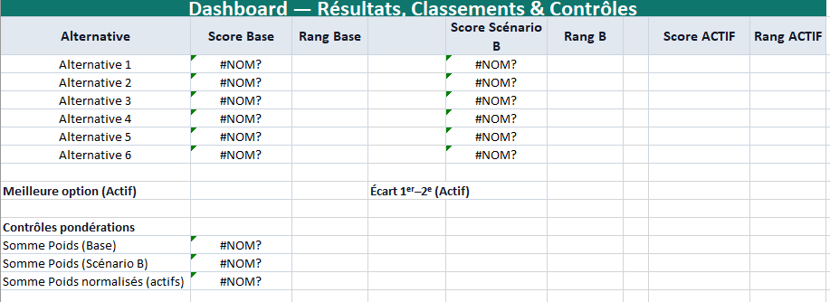 • Dashboard : scores, rangs, meilleure option active, écart 1ᵉʳ–2ᵉ, contrôles de cohérence.
