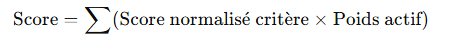• Critère Bénéfice : (note - min) / (max - min) × poids