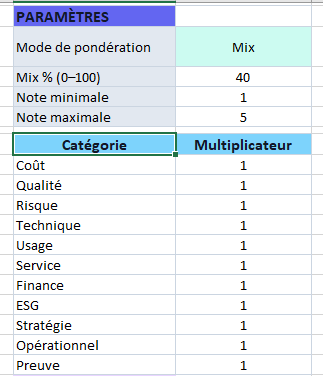 - Critères (8 lignes par défaut) : Type (Bénéfice ou Coût), Poids Base, Poids B, Poids actif (calculé selon le Mode), Min/Max.