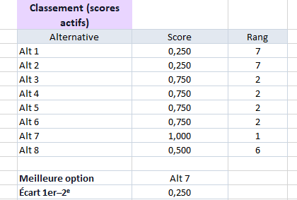 - Score : valeur agrégée (0–1 si les poids sont normalisés), directement comparable entre alternatives.