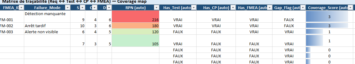 - Formules : RPN, Has_ (Test/CP/FMEA), Gap_Flag, Coverage_Score.