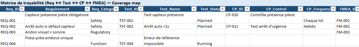 Objectif : Relier chaque exigence (Req) à au moins un Test, un Contrôle de Process (CP) et une entrée FMEA, pour visualiser la couverture et révéler instantanément les trous (gaps).