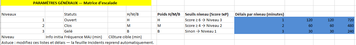 - Dans l’onglet Paramètres, vérifie les délais par niveau et les listes (Niveaux, Statuts, H/M/B).