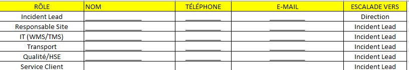 Rôles clés (Incident Lead, Site, IT, Transport, Qualité/HSE, Service client) et chaîne d’escalade.