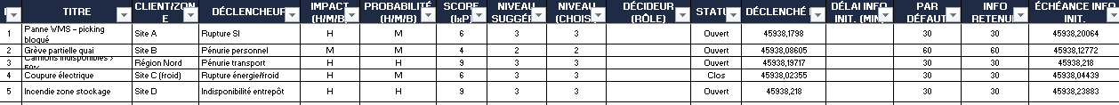 La matrice d’escalade PCA est un classeur Excel pensé pour piloter un incident logistique en temps réel : qualification rapide, délais contractuels, messages cadencés et décision visible. Cette version introduit une esthétique claire, des calculs étendus (scores, niveaux suggérés, échéances, SLA) et un jeu d’exemples préremplis pour démarrer sans friction.