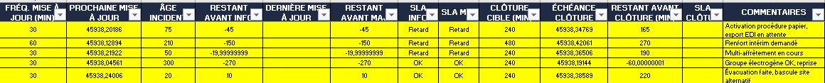 - Si l’info initiale part à 10:45, SLA Info = Retard ; l’alerte passe au rouge.