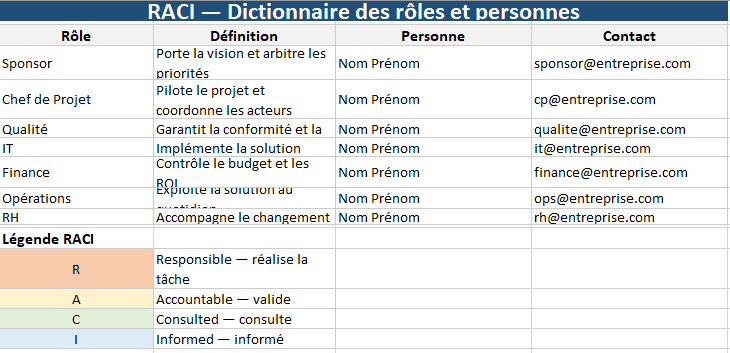 - Dictionnaire rôle → personne → contact pour traduire la matrice en équipe réelle.