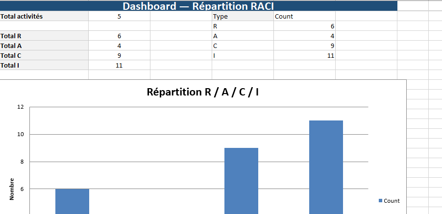 - Histogramme répartition R/A/C/I (vue synthétique pour comité).