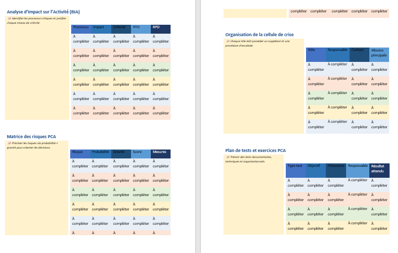 📄 Télécharger le modèle Word premium du mémoire PCA — plan complet, tableaux BIA, matrice des risques et annexes prêts à remplir.